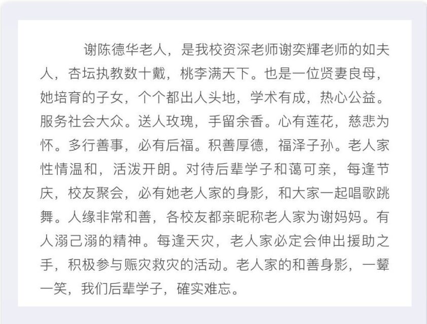 五,作者利用短短的一段话,精华的四字词句,成功地描述了文章的主人翁,德高望重的谢陈德华老人的平易近人,慈善心怀,爱国爱乡,热衷于行善的生平事迹,让读者留下深刻的印象,受到了莫大的教育。