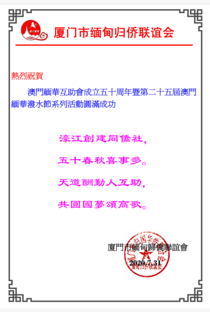 转载请注明:《贺澳门缅华互助会成立50周年(厦门市缅甸归侨联谊会)》 复制链接