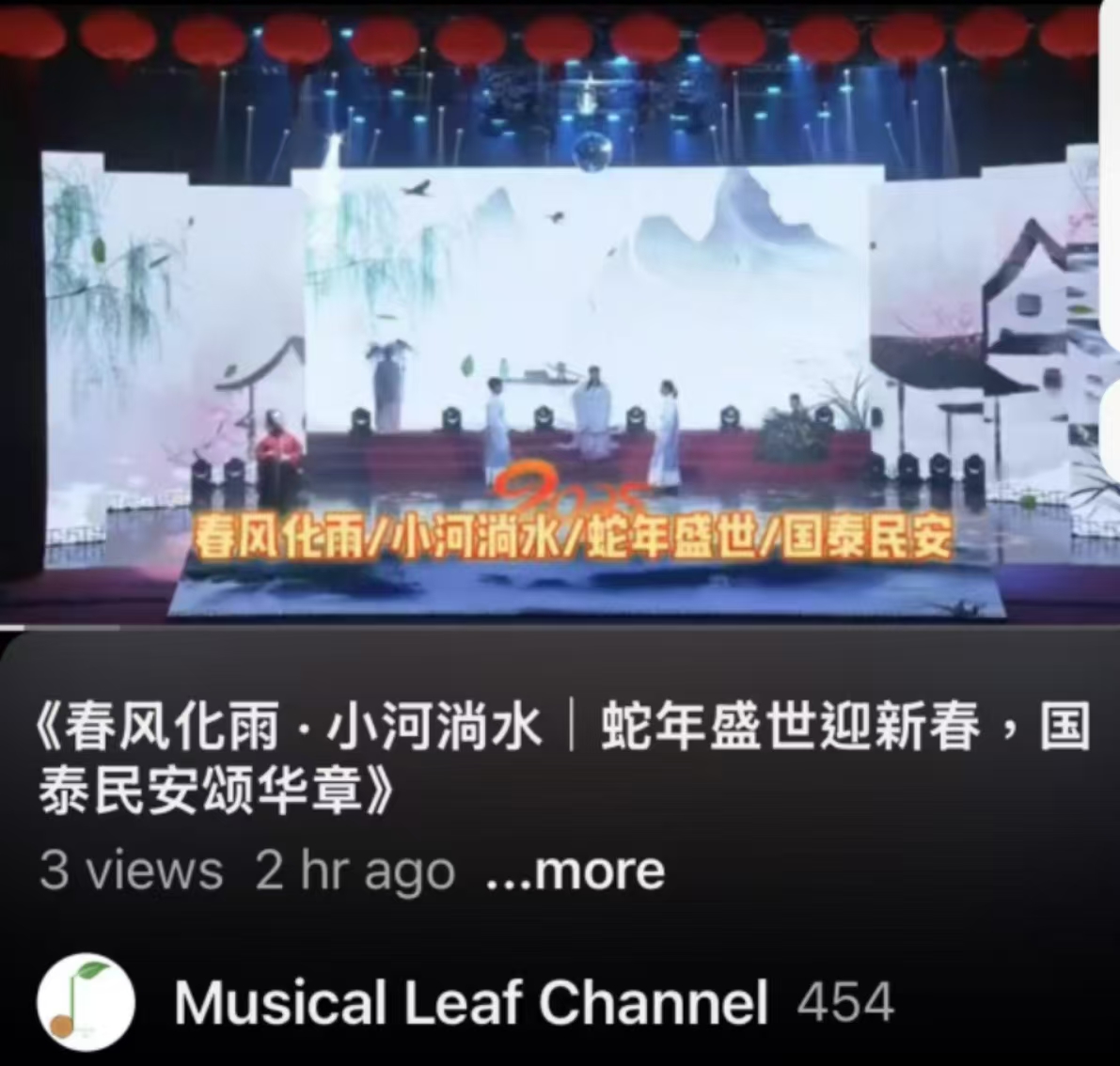打开手机,首先映入眼帘的是赖德辉先生于凌晨1:58从英国传来的消息。他在“Musical Leaf Channel(叶乐)”上发布的一张视频截图,那是我日前在微信上分享的信息,内容是我与深圳信息学院——全国高校非遗传承示范单位一个合作演绎的《树叶吹奏.小河淌水》。赖先生将其转载至海外平台,并在字幕后添加了几个醒目的字——迎新春,颂华章。