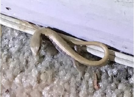 次日一早准备开後门去後園浇花果,经过孫女们的玩具箱,看到玩具箱附近有一条小小的淺棕色的東西,以为是一小条乾草,蹲下去准备把它检起來丢進垃圾桶,谁知这东西还会动,仔细一看,原来又是昨天那条小四脚蛇,不知什么时候跑進家里来了。