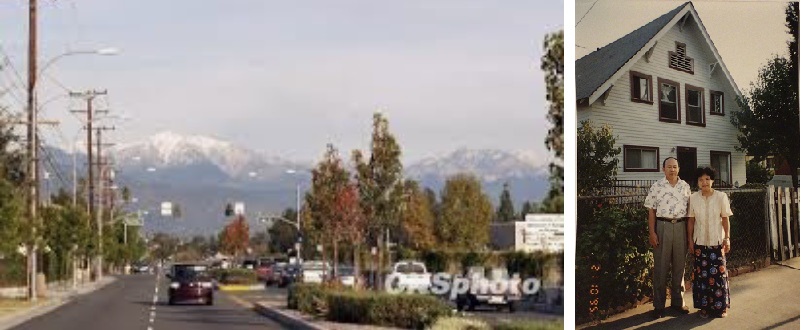 左:洛杉矶冬季雪山风光 右:作者夫妇旧居前留影