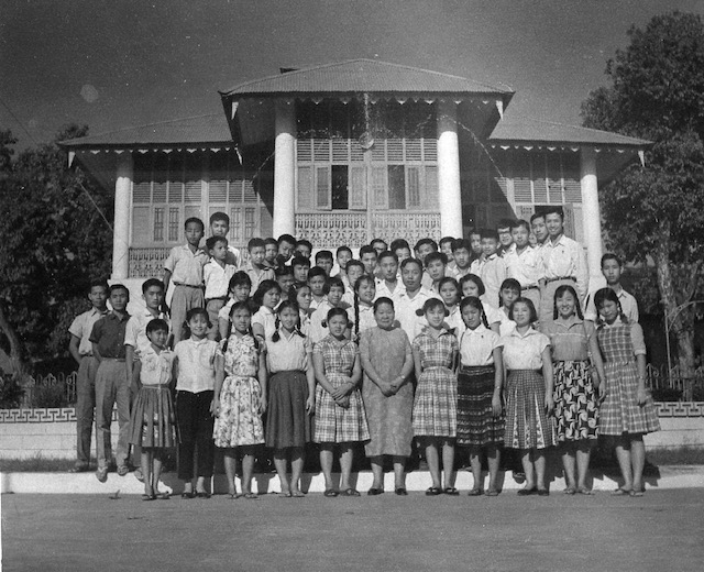 1961年,学生会干事与校长李国华(中)、教导主任萧维梅(二排右四)及部分教师在校园广庇楼前合影。