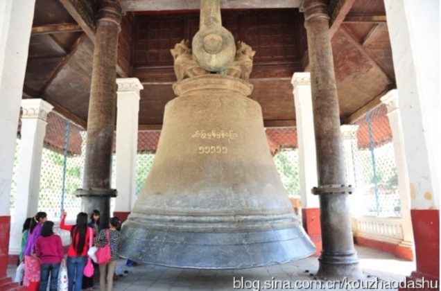 下午回到曼德勒,听人说10英里外有个古代王朝敏昆遗址,那里有世界第二大铜鐘,来曼德勒不去看,非常可惜。于是第三天我们达乘小铁皮机动船,顺着著名的伊洛瓦底江,前往参观。景点就在江边。一上岸就见到古迹。一对巨大的狮子望江而立。可惜,被江水侵蚀,只剩下后半身。若能按比例修复全身,那一定是高大无比,龎然大物,天下第一大狮雕。走到大鐘掛放的尖顶亭楼,金黄巨大的铜鐘出现在眼前,参观者必须抬头仰望。似是一次性浇铸而成。充分体现了古人的智慧。上有"明漂虻虻标"5个缅文字。这5个字的字母,在33个缅文字母中,均排在第5行。它们均代表数字5。下有5个缅文数字5,代表五万五千五百五十五缅斤。足足有十吨重。