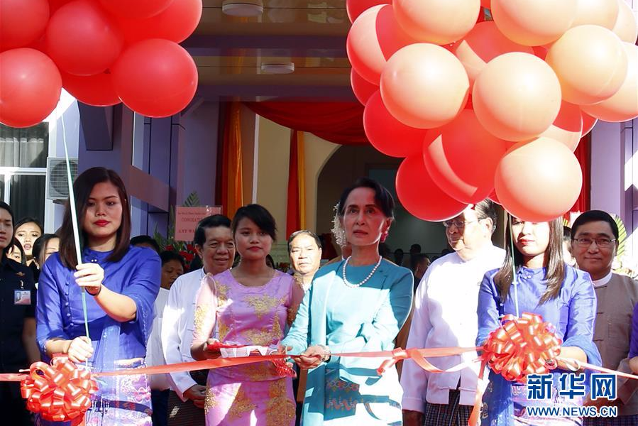 12月23日,在缅甸仰光,国务资政昂山素季(右四)在移交启用仪式上剪彩。