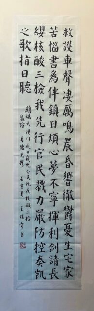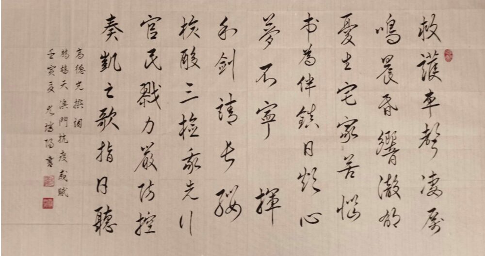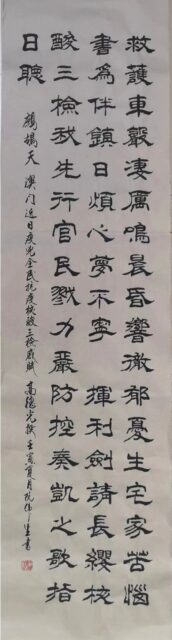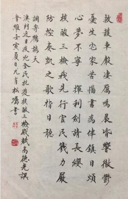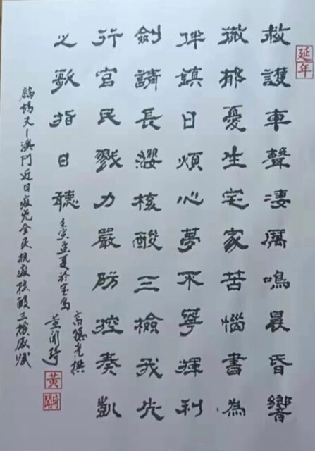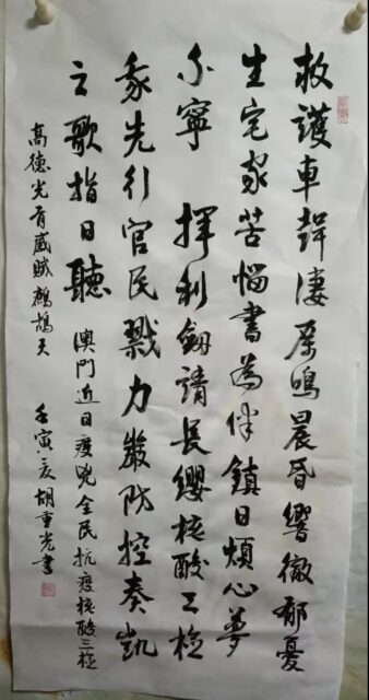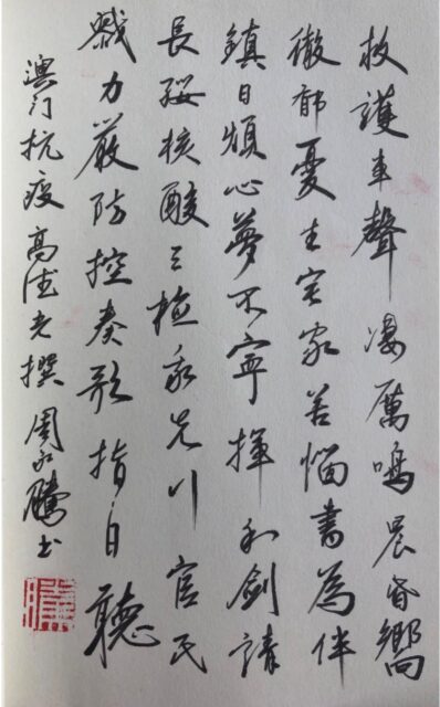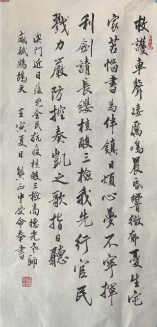 近日疫情肆虐,是澳門至今最為嚴峻之時,難免惹恐慌,但市民自覺遵從政府指示,眾志成城,官民合力,嚴防嚴控,其心也誠,其志也堅,感而作鷓鴣天一闋,冀引發正能量以資激勵。拙句發上群組後,本澳眾多書法名家和愛好者紛紛揮毫,以書法為載體書傳網上,互相勉勵,期盼早渡刼波,還蓮花寶地昔日之光輝。今日收輯整理希能廣傳也。