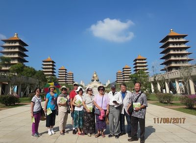 高雄的主要景点是佛光山,这里又分佛光山寺和佛陀纪念馆两处,我们只参拜了位于佛光寺旁的佛陀纪念馆,主建筑位于中轴线,占地广阔,前有八座佛塔分列两边,后有高50公尺的大金佛。气势磅礴,十分震撼。两处寺庙都是星云大师开山創建。匆匆看完纪念馆,我们要求去参观佛光山寺并顺便吃斋,靓女导游却说那里正在装修,那里的斋也并不好吃等等,我们也不想强求,只好作罢。