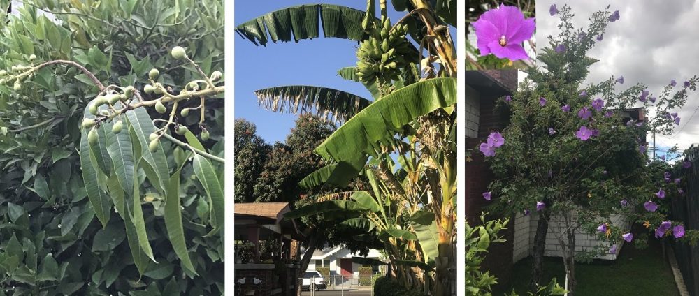 图1:2012年吃完的果核栽培的迷你芒果。图2: 隔邻的芭蕉也长过界来凑热闹,品种味美。图3: 大儿子送的生日礼物“木槿”已接连开花十几个春秋,赏心悦目。