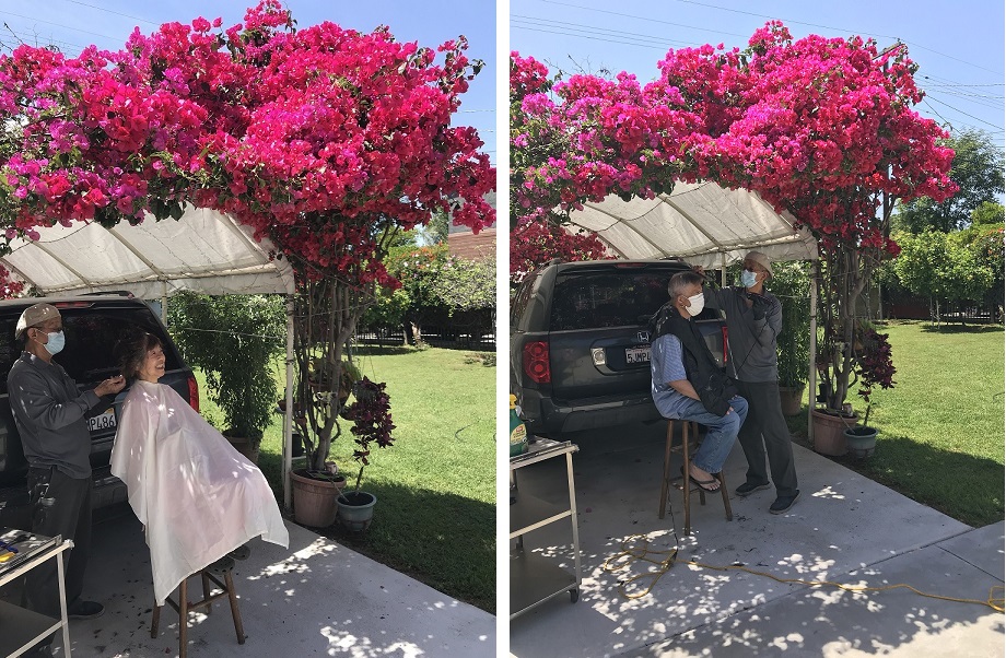 网传理发店等公共场所是传播疫情最危险的地方。一来这一行业未批准重开,二来不敢也不愿去光顾。幸亏弟弟家住对面,他自学的理发术也有两下功夫,家里都有理发工具箱,于是自家的花园发廊开张了。空气新鲜,环境优美,比外面的发廊还优越。