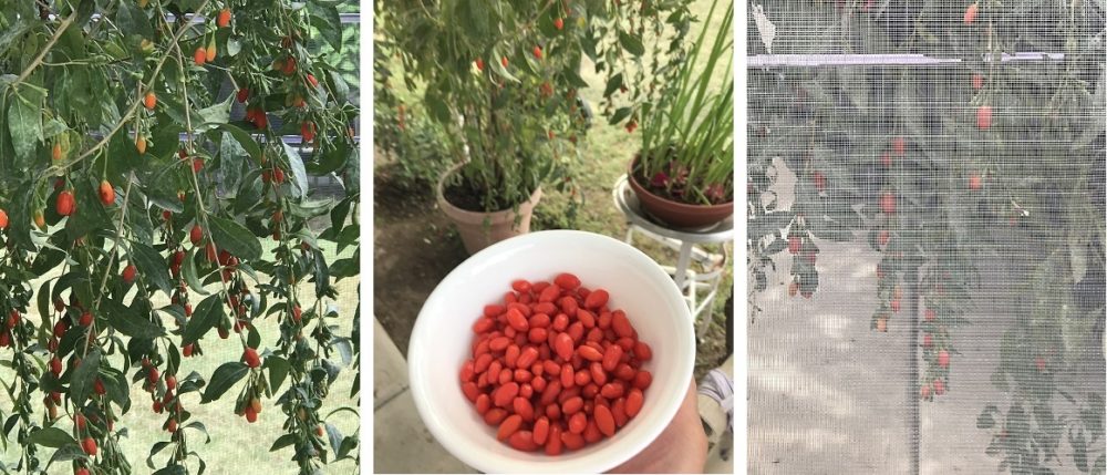 近来雨水充足,杞子不但提前开花结果,果实也比往年多而大,引来鸟儿啄食,赶紧拉网保护。