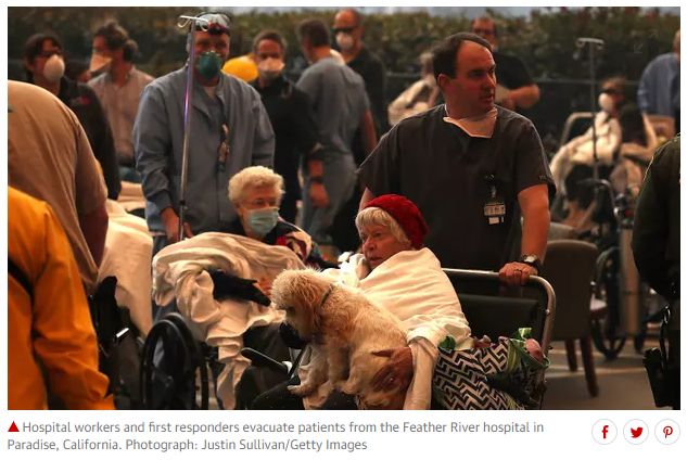 美国加州北部27,000人的天堂镇被爆炸性的“坎普野火”(Camp Fire)蹂躏,