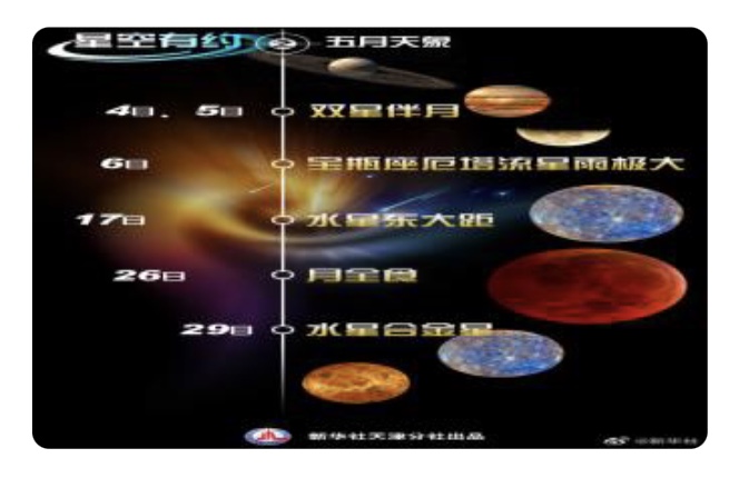 送走4月,迎来5月。5月的“天象剧场”安排了哪些精彩大片?天文科普专家介绍,“双星伴月”“宝瓶座厄塔流星雨极大”“水星东大距”“月全食”“水星合金星”等多部“天象大片”将会轮番上映。其中,“月全食”还喜逢年度“最大满月”,这轮“超级红月亮”令人期待。(记者周润健)