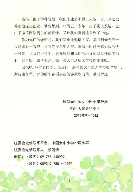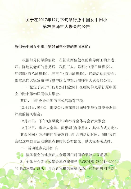 关于在2017年12月下旬举行原中国女中附小第29届师生大聚会的公告