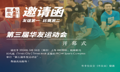 谨定于2024年5月26日(周日)上午8:30,假座仰光时代城(Times City)Times Mall 五楼的WOW Sports Complex举行“第三届华友运动会“,恭请光临指导! 今年的华友运动会吸引了包括缅甸华侨华人慈善会、中国企业商会、缅甸福建同乡总 会、缅甸广东工商总会、南中校友会、缅甸福州三山同乡总会、东方学校、博文学校、缅华妇协教育中心、庆福华文学苑、缅甸国际教育中心(MIEC)、舜裔颍川青年组、缅甸仰光九龙堂、缅甸太原王氏家族会及我会在内的 15 支参赛队伍的 431 名运动员。比赛项目有拔河、台球、游泳、国际象棋、乒乓球及羽毛球。 本届运动会的宗旨是:友谊第一,比赛第二。以提升缅甸华侨华人,尤其是缅华青年之间的凝聚力、培养团结精神。 华中校友会(华友会)敬邀 ...